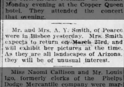 Effie made her solo exhibit debut at the Bisbee Woman’s Club on March 23rd, 1921. At least, it’s the first known solo exhibit we have a record of, thanks to newspapers of the time.